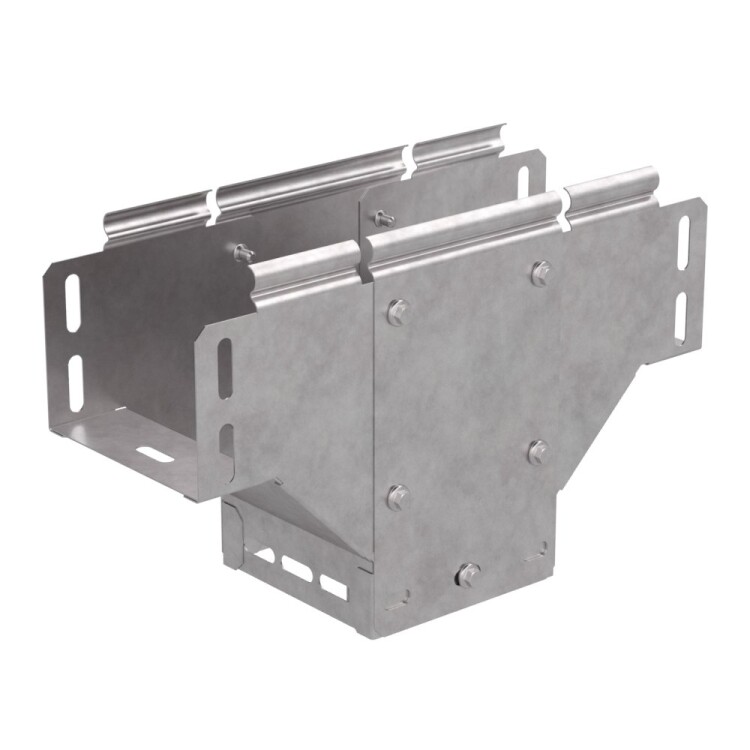 Аксессуары изготовленные из стали с защитным покрытием по методу Сендзимира – это изделия, на которых защитное цинковое покрытие было нанесено на листовую сталь перед изготовлением. Толщина защитного покрытия варьируется от 10 до 22мкм. Климатическое исполнение изделий УХЛ2, что предусматривают эксплуатацию в помещении и под навесом, при температуре эксплуатации от -80 до +150°С. Ответвитель Т-образный вертикальный применяется для обеспечения полноразмерного ответвления горизонтальной кабеленесущей системы из лотков металлических в вертикальном направлении.
