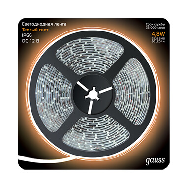 Лента LED 2835/60-SMD 4.8W 12V DC теплый белый IP66 (блистер 5м), Тип 2835, 4,8Вт, 12В