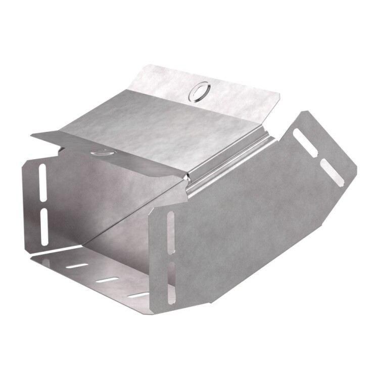 Аксессуары изготовленные из стали с защитным покрытием по методу Сендзимира – это изделия, на которых защитное цинковое покрытие было нанесено на листовую сталь перед изготовлением. Толщина защитного покрытия варьируется от 10 до 22мкм. Климатическое исполнение изделий УХЛ2, что предусматривают эксплуатацию в помещении и под навесом, при температуре эксплуатации от -80 до +150°С. Угол вертикальный внутренний 45 градусов предназначен для подъема кабельных трасс на 45 градусов, для перфорированных и глухих лотков. В комплект входит крышка.