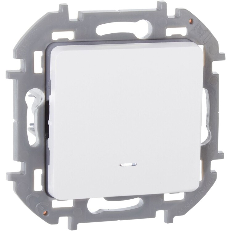 Выключатель одноклавишный с подсветкой/индикацией скрытого монтажа Inspiria, цвет "Белый", номинальный ток 10АХ, напряжение ~250В, безвинтовые зажимы. Устанавливается в жилых и общественных помещениях для управления приборами освещения, вентиляции и т.д.