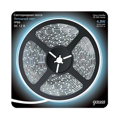 Лента LED 2835/60-SMD 4.8W 12V DC холодный белый IP66 (блистер 5м), Тип 2835, 4,8Вт, 12В