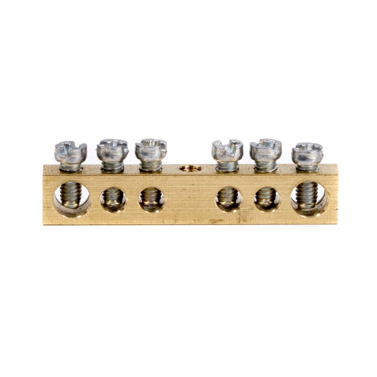 Шина применяется для коммутации кабелей, проводов, питающих жил. Расчитана на работу с токами до 63 А. Крепление шины по центру. Шина имеет 6 отверстий для коммутации. 2 отверстия сечением 6 мм?, 4 отверстия сечением 4 мм?.