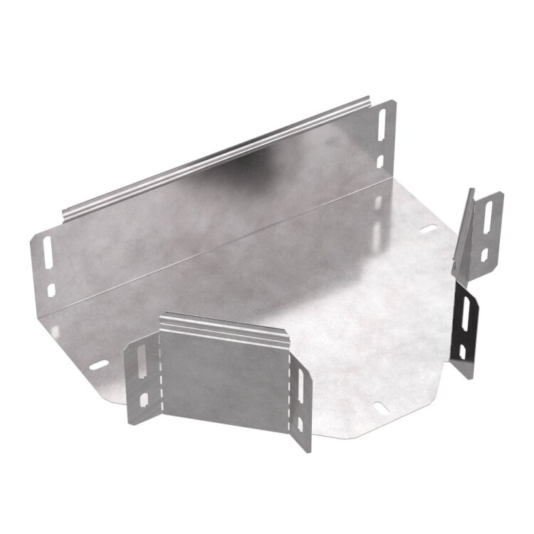 Аксессуары изготовленные из стали с защитным покрытием по методу Сендзимира – это изделия, на которых защитное цинковое покрытие было нанесено на листовую сталь перед изготовлением. Толщина защитного покрытия варьируется от 10 до 22мкм. Климатическое исполнение изделий УХЛ2, что предусматривают эксплуатацию в помещении и под навесом, при температуре эксплуатации от -80 до +150°С. Ответвитель Т-образный предназначен для разветвления кабельных трасс в горизонтальном направлении, для перфорированных и глухих лотков. В комплект не входит крышка.