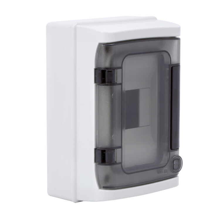 Настенный модульный щиток с прозрачной затемненной дверцей. Предназначен для монтажа в жилых и административных помещениях для установки автоматических выключателей любых производителей: таймеров, устройств защитного отключения и управления освещением и т.д. В комплект поставки входят: ручка на дверце, оцинкованная DIN-рейка, заглушки для пустых модулей, сборочные винты. Степень пыле- и влагозащиты IP 65. Ударопрочность корпуса IK09. Количество модулей - 4. Параметры щитка: ширина - 142 мм, высота - 210 мм, глубина - 100 мм. Материал - термостойкий пластик. Цвет - серый.