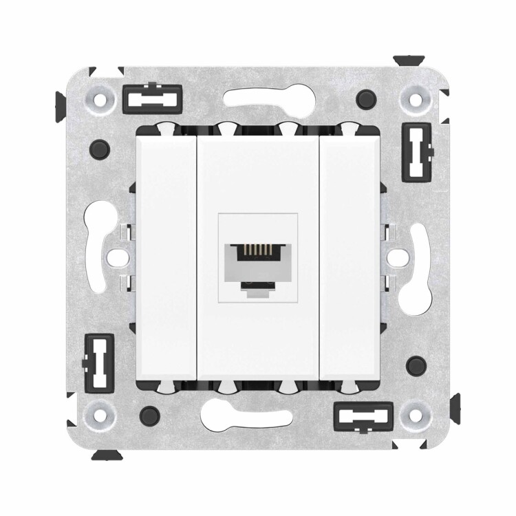 Телефонная розетка RJ-12 без шторки используется для коммутации линий телефонной связи в патч-панелях или для связи телефонных аппаратов с розеткой. Предназначена для скрытого монтажа в стену, поставляется в комплекте с суппортом. Материал – металл, термопласт. Пластиковые детали электроустановочного изделия имеют цвет ""Белое облако"".