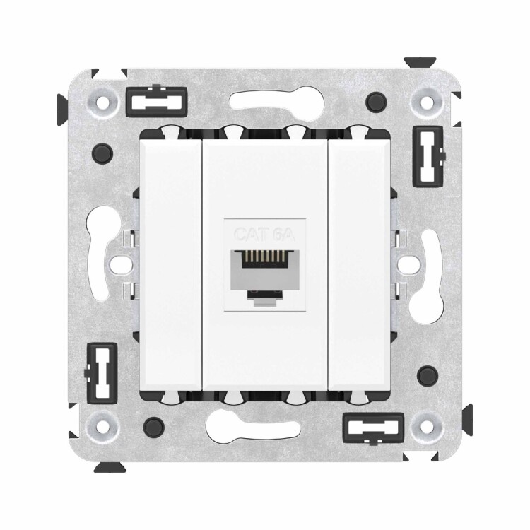 Компьютерная розетка без шторки используется для подключения компьютерной техники и соединения с патч-панелью. Предназначена для скрытого монтажа в стену, поставляется в комплекте с суппортом. Розетка RJ-45 категории 6А может использоваться для организации сетей с частотой до 500 МГц и передавать данные до 10 Гбит/с. Материал розетки - металл, термопласт.Пластиковые детали изделия выполнены в цвете ""Белое облако"".