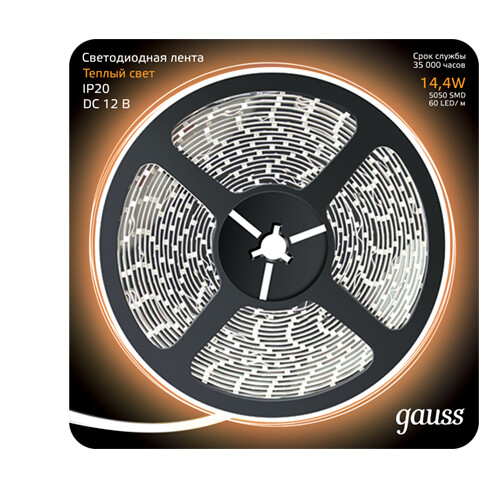 Лента LED 5050/60-SMD 14.4W 12V DC теплый белый (блистер 5м), Тип 5050, 14,4Вт, 12В