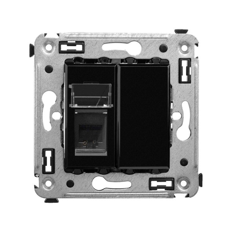 Телефонная розетка RJ-12 от ДКС устанавливается в стену (скрыто) и применяется для связи телефонных линий или же коммутации телефонных аппаратов с розеткой. Материал – металл, термопласт. Пластиковые части имеют нежный оттенок "Черный квадрат" – изысканный, таинственный, мистический черный, придающий особый шарм лаконичным формам рамок для ЭУИ "Avanti".