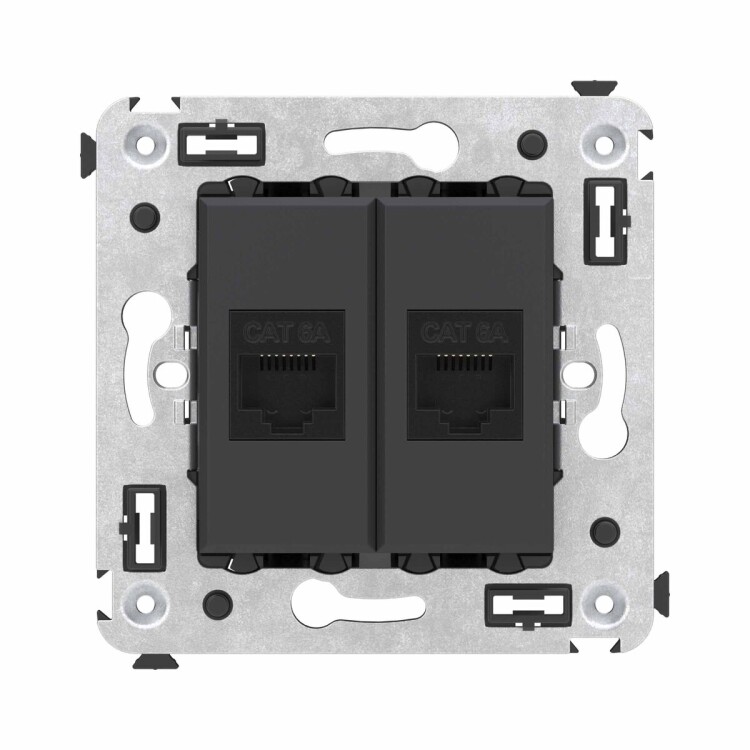 Компьютерная розетка без шторки используется для подключения компьютерной техники и соединения с патч-панелью. Предназначена для скрытого монтажа в стену, поставляется в комплекте с суппортом. Розетка RJ-45 категории 6А может использоваться для организации сетей с частотой до 500 МГц и передавать данные до 10 Гбит/с. Материал розетки – металл, термопласт.Пластиковые детали изделия выполнены в цвете ""Черный квадрат"".