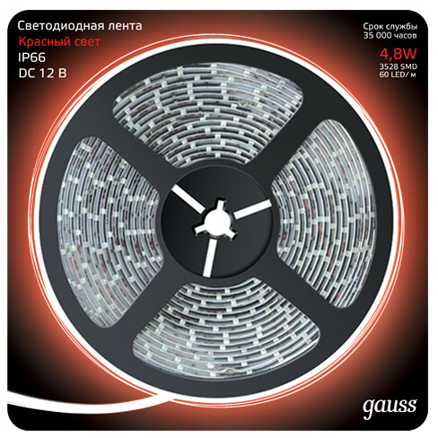 Лента LED 2835/60-SMD 4.8W 12V DC красный IP66 (блистер 5м), Цветная , 4,8Вт, 12В