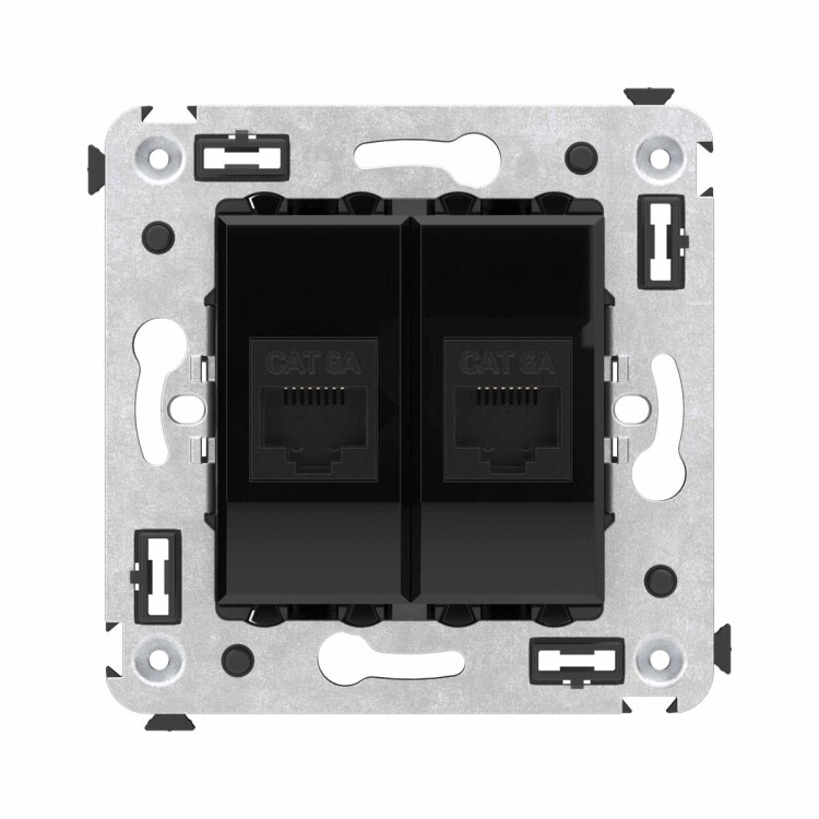 Компьютерная розетка без шторки используется для подключения компьютерной техники и соединения с патч-панелью. Предназначена для скрытого монтажа в стену, поставляется в комплекте с суппортом. Розетка RJ-45 категории 6А может использоваться для организации сетей с частотой до 500 МГц и передавать данные до 10 Гбит/с. Материал розетки – металл, термопласт.Пластиковые детали изделия выполнены в цвете ""Закаленная сталь"".
