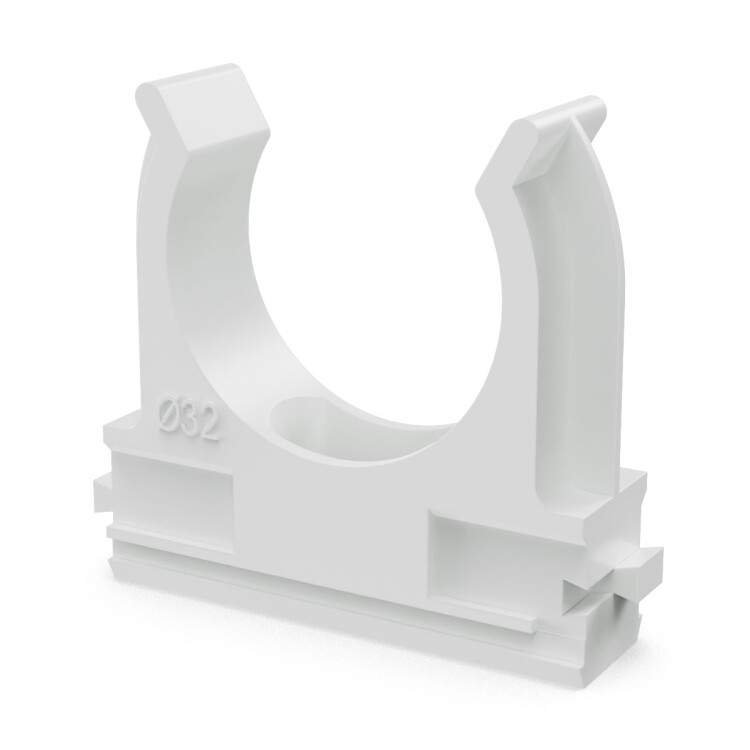 Предназначена для крепления гладких труб ПВХ или гофрированных труб одного диаметра к поверхности стен, потолков, полов или перегородок. Для монтажа предусмотрено технологическое отверстие под дюбель или саморез. Для удобства блочного монтажа состыковываются друг с другом с помощью специальных фиксаторов типа «ласточкин хвост».