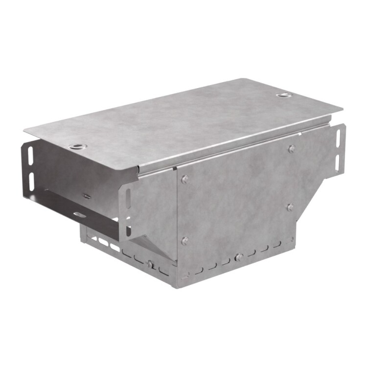 Аксессуары изготовленные из стали с защитным покрытием по методу Сендзимира – это изделия, на которых защитное цинковое покрытие было нанесено на листовую сталь перед изготовлением. Толщина защитного покрытия варьируется от 10 до 22мкм. Климатическое исполнение изделий УХЛ2, что предусматривают эксплуатацию в помещении и под навесом, при температуре эксплуатации от -80 до +150°С. Применяется для обеспечения полноразмерного ответвления горизонтальной кабеленесущей системы из лотков металлических в вертикальном направлении.