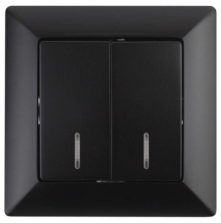 <p>Выключатель 2-клавишный с подсветкой серии Intro Solo скрытой установки цвет антрацит 4-105-05. Номинальные характеристики 10А 250В . Выключатель выполнен из качественного негорючего термопласта, укомплектован одноместной рамкой, оснащён винтовыми клеммами. Вертикальное расположение клемм обеспечивает удобный и надёжный монтаж. Клеммы с двумя отверстиями позволяют соединять соседние выключатели шлейфом. Установка в подрозетник производится как на монтажные лапки, так и на винты. Для установки 2-х и более выключателей в несколько подрозетников в ряд дополнительно используются многоместные рамки: 2-х постовая - 4-502-хх, 3-х постовая 4-503-хх, 4-х постовая - 4-504-хх (где хх - цветовой код: 01 - белый, 02 - слоновая кость, 03 - алюминий, 04 - шампань, 05 - антрацит, 10 - венге, 11 - сосна).</p>