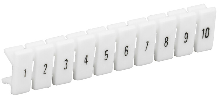 Устанавливаются в соответствующие пазы клеммы. Выполнены в виде пластин с десятью маркировочными площадками. Каждая площадка легко отсоединяется друг от друга.