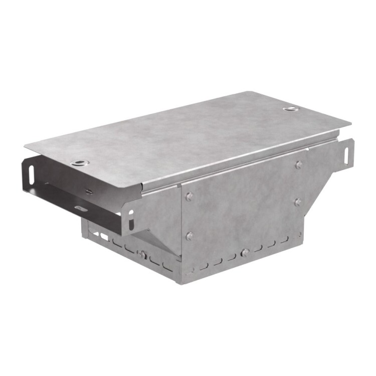 Аксессуары изготовленные из стали с защитным покрытием по методу Сендзимира – это изделия, на которых защитное цинковое покрытие было нанесено на листовую сталь перед изготовлением. Толщина защитного покрытия варьируется от 10 до 22мкм. Климатическое исполнение изделий УХЛ2, что предусматривают эксплуатацию в помещении и под навесом, при температуре эксплуатации от -80 до +150°С. Применяется для обеспечения полноразмерного ответвления горизонтальной кабеленесущей системы из лотков металлических в вертикальном направлении.