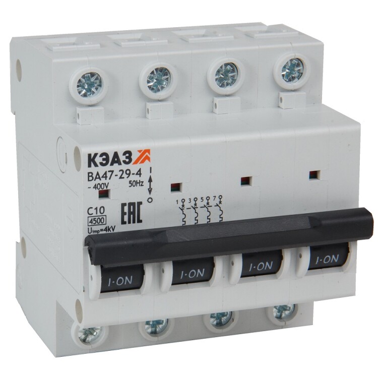 Модульный автоматический 4 полюсный выключатель переменного тока с предельной коммутационной способностью при переменном токе 4.5 кА на номинальный ток 50 А . Модульные автоматические выключатели КЭАЗ на токи до 63А защищают оборудование от токов перегрузки и короткого замыкания в системах распределения электроэнергии. Автомат ВА 47-29 специально разработан для использования в экономичных решен иях с ограниченным бюджетом.