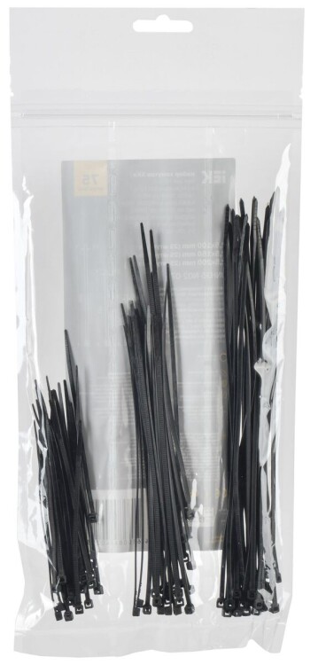 Набор включает в себя по 25 чёрных кабельных хомутов каждого размера - 2,5х100;2,5х150;2,5х200.