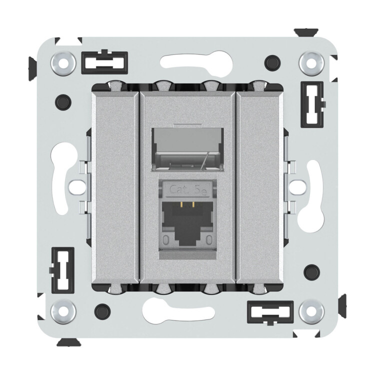 Компьютерная розетка одинарная экранированная используется для подключения компьютерной техники и соединения с патч-панелью. Компьютерная розетка предназначена для скрытого монтажа в стену, поставляется в комплекте с суппортом. Розетка RJ-45 категории 5e – это наиболее популярная на сегодняшний день модель. Она позволяет организовать сеть с частотой 125 МГц и скоростью до 1000 Мбит/с. Материал – м еталл, термопласт. Пластиковые детали устройства имеют оттенок ""Закаленная сталь"".