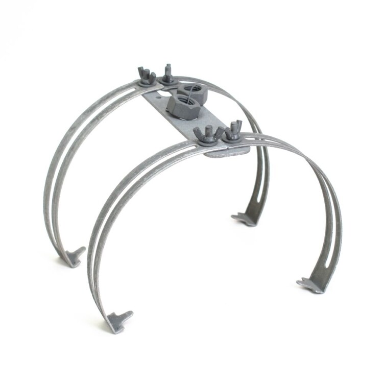 Держатель молниеприёмника на круглый конёк двойной TDZ Промрукав предназначен для установки молниеприемника высотой от 1 до 2 метров на круглый конек черепичной кровли. Он обеспечивает надежное и безопасное крепление молниеприемника, что позволяет эффективно отводить электрические разряды от молний в землю.