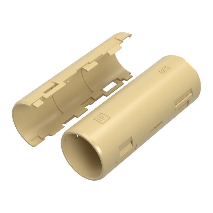 Муфта разборная позволяет соединять гофрированные и гладкие трубы различных типоразмеров без использования специальных инструментов, как при прокладке проложенной кабеленесущей трассе вновь, так и по ранее смонтированной системе труб, в том числе с переходом с гофрированной трубы на гладкую одного типоразмера.
