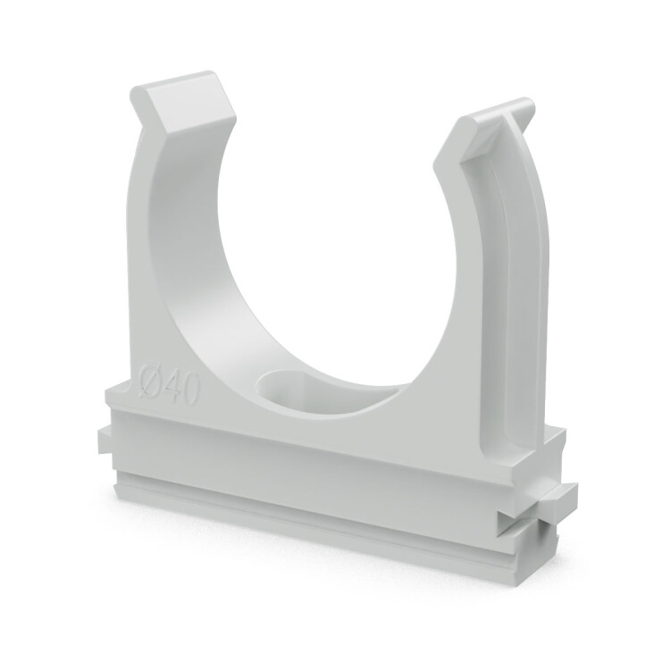 Предназначена для крепления гладких труб ПВХ или гофрированных труб одного диаметра к поверхности стен, потолков, полов или перегородок. Для монтажа предусмотрено технологическое отверстие под дюбель или саморез. Для удобства блочного монтажа состыковываются друг с другом с помощью специальных фиксаторов типа «ласточкин хвост».