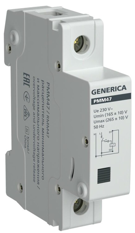Расцепитель минимального/максимального напряжения РММ47 на DIN-рейку отключает автоматический выключатель при выходе напряжения за допустимые пределы (165–265 В).
