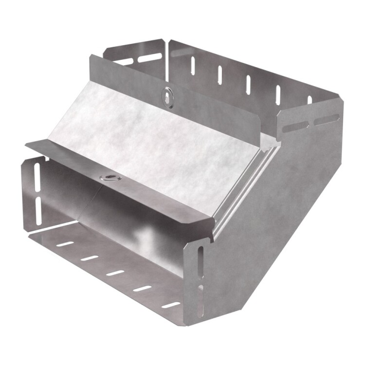 Аксессуары изготовленные из стали с защитным покрытием по методу Сендзимира – это изделия, на которых защитное цинковое покрытие было нанесено на листовую сталь перед изготовлением. Толщина защитного покрытия варьируется от 10 до 22мкм. Климатическое исполнение изделий УХЛ2, что предусматривают эксплуатацию в помещении и под навесом, при температуре эксплуатации от -80 до +150°С. Угол вертикальный внутренний 90 градусов предназначен для подъема кабельных трасс на 90 градусов, для перфорированных и глухих лотков. В комплект входит крышка.