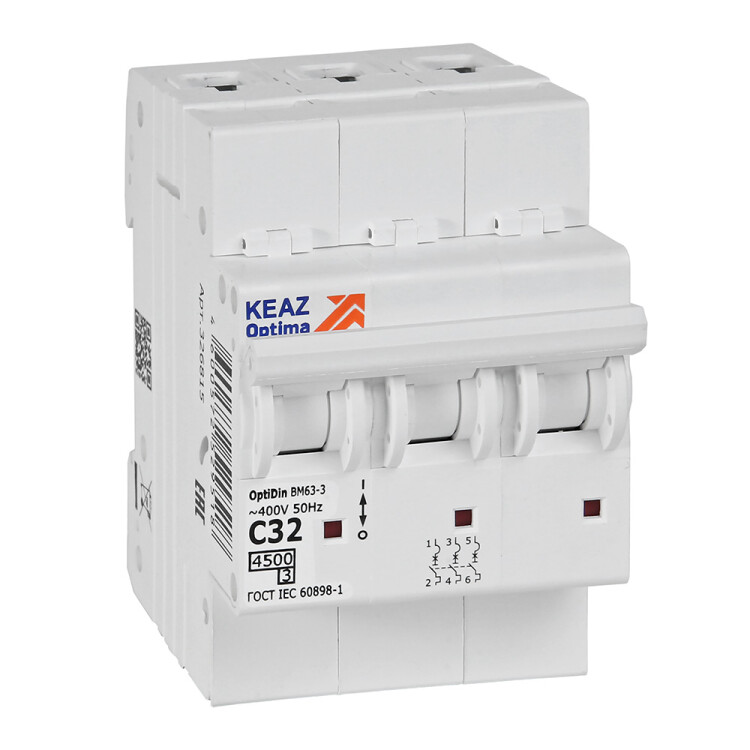 Модульный автоматический 3 полюсный выключатель переменного тока с предельной коммутационной способностью при переменном токе 4,5 кА на номинальный ток 32 А. Модульные автоматические выключатели OptiDin ВМ63 4,5 кА предназначены для применения в электрических цепях напряжением до 400 В переменного тока частоты 50 Гц, их защиты при перегрузках и коротких замыканиях, проведения тока в нормальном режиме и оперативных включений и отключений указанных цепей (до 30 раз в сутки). OptiDin ВМ63 4,5 кА разработаны специально для использования в жилищном секторе - распределительных, квартирных и этажных щитах.