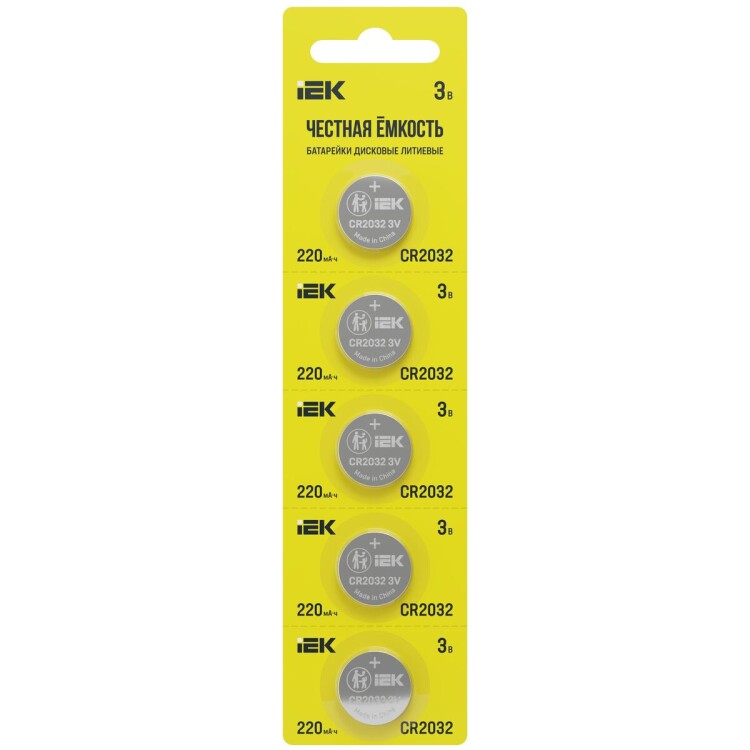 Батарейка дисковая литиевая IEK CR2032, 5 шт. на блистере. IEK применяет технологии, которые позволяют создать батарейки с длительным временем работы и стабильным качеством. Батарейки «Честная ёмкость» производятся в соответствии с международным стандартом IEC и проходят двойной контроль качества каждой партии. Батарейка подходит для использования в весах, гирляндах, калькуляторах, автомобильных кл ючах и брелоках автосигнализаций, пультах ворот и шлагбаума, часах, трекерах, материнских платах компьютера или ноутбука, глюкометрах, пульсометрах, термометрах и других устройствах. Соответствует ГОСТ 12.2.007.12, ГОСТ Р МЭК 55086-1 (IEC 55086-1).