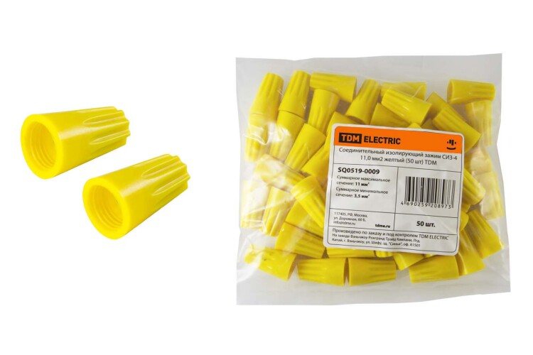 Соединительный изолирующий зажим СИЗ-4 11,0 мм2 желтый (50 шт) TDM используется для электрического соединения, фиксации и изоляции пучка проводов.