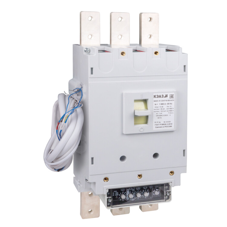 Силовой 3 полюсный автоматический выключатель переменного тока в литом корпусе на номинальный ток 630 А. Выключатели КЭАЗ предназначены для применения в электрических цепях переменного тока частоты 50,60 Гц напряжением 690 В, для нечастых оперативных включений и отключений (до 6 в час), указанных цепей и защиты электрооборудования от перегрузок и коротких замыкании, а также не частых прямых пусков асинхронных двигателей. Выключатели изготавливаются с полупроводниковым максимальным расцепителем тока на базе микроконтроллера Almega 16L. Выключатели с приемкой Российского морского регистра судоходства и Российского Речного Регистра предназначены для защиты судового электрооборудования.