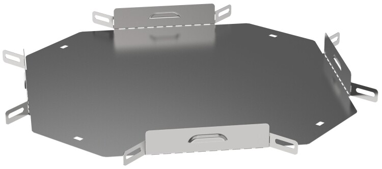 Крестовина предназначен для организации X-образного разветвления кабельной трассы в горизонтальной плоскости. Аксессуар поставляется в плоском виде, имеет направляющую перфорацию для сгиба и сборки изделия перед установкой. Стыковка аксессуара с лотком осуществляется за счёт телескопического соединителя. Подходит для всех типов листовых лотков серии ESCA. Крышка на аксессуар заказывается отдельно. Аксессуар изготовлен из стали оцинкованной методом Сендзимира (защитный слой цинка не менее 5-10 мкм).