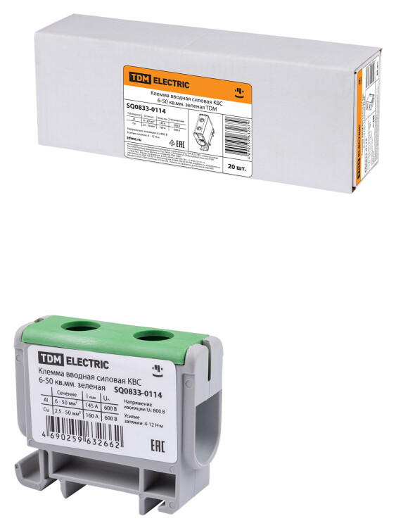 Назначение клемма вводная силовая КВС 6-50 кв.мм. зеленая TDM