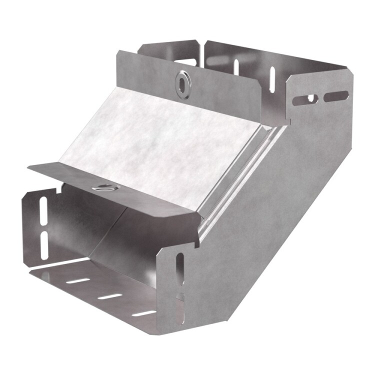 Аксессуары изготовленные из стали с защитным покрытием по методу Сендзимира – это изделия, на которых защитное цинковое покрытие было нанесено на листовую сталь перед изготовлением. Толщина защитного покрытия варьируется от 10 до 22мкм. Климатическое исполнение изделий УХЛ2, что предусматривают эксплуатацию в помещении и под навесом, при температуре эксплуатации от -80 до +150°С. Угол вертикальный внутренний 90 градусов предназначен для подъема кабельных трасс на 90 градусов, для перфорированных и глухих лотков. В комплект входит крышка.
