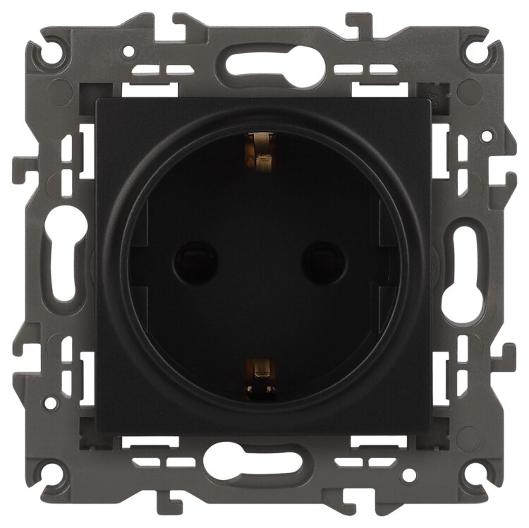 Розетка с заземлением со шторками Эра Elegance антрацит 14-2102-05. Оснащёна автоматическими клеммами для надёжной фиксации жил кабеля в механизме. Рамки приобретаются отдельно. Рамки Эра Elegance ПЛАСТИК: 1 пост 14-5001-хх, 2 поста 14-5002-хх, 3 поста 14-5003-хх, 4 поста 14-5004-хх, 5 постов 14-5005-хх; СТЕКЛО: 1 пост 14-5101-хх, 2 поста 14-5102-хх, 3 поста 14-5103-хх, 4 поста 14-5104-хх; МЕТАЛЛ: 1 пост 14-5201-хх, 2 поста 14-5202-хх, 3 поста 14-5203-хх, 4 поста 14-5204-хх; ДЕРЕВО: 1 пост 14-5301-хх, 2 поста 14-5302-хх, 3 поста 14-5303-хх, 4 поста 14-5304-хх (хх - код цвета: 00-прозрачный, 01-белый, белёный дуб, 02-слоновая кость, 03-алюминий, 04-шампань, 05-чёрный, чёрное дерево, 07-ясень, 09-дуб, 10-венге, 11-клён, 14-медь, 21-жёлтый, 22-оранжевый, 23-красный, 25-бордо, 26-лайм, 27-зелёный, 28-голубой, 29-синий, 30-розовый, 31-мокко, 32-серый, 41-сталь, 42-титан).