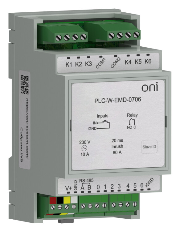 Модуль расширения входов/выходов для контроллеров PLC-W 7 DI "сухой контакт", групповая изоляция и 6 DO 250В AC или 30 В DC максимальный коммутируемый ток для резистивной нагрузки — 10 А, максимальный пусковой ток 80А (в течение 20 мс, для контакта НО). С коммуникацией Modbus RTU.