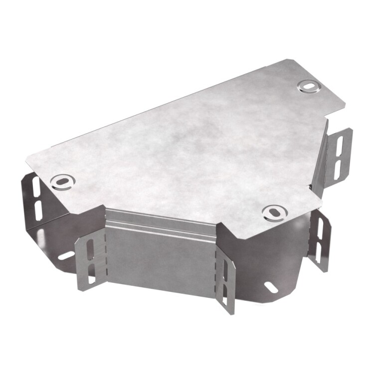 Аксессуары изготовленные из стали с защитным покрытием по методу Сендзимира – это изделия, на которых защитное цинковое покрытие было нанесено на листовую сталь перед изготовлением. Толщина защитного покрытия варьируется от 10 до 22мкм. Климатическое исполнение изделий УХЛ2, что предусматривают эксплуатацию в помещении и под навесом, при температуре эксплуатации от -80 до +150°С. Т-образный ответвитель предназначен для разветвления кабельных трасс в горизонтальном направлении,для перфорированных и глухих лотков. В комплект входит крышка.