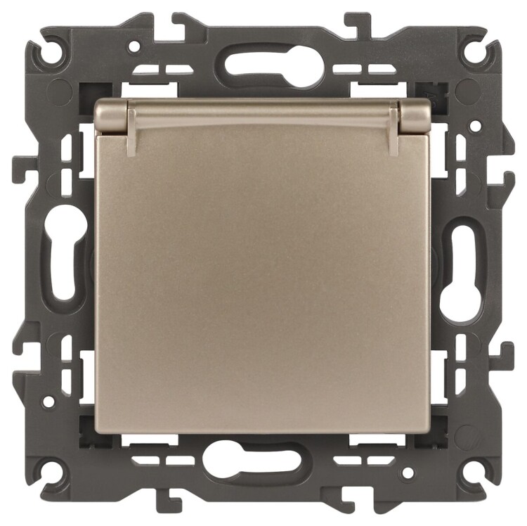 Розетка с заземлением шторки крышка Эра Elegance шампань 14-2103-04. Оснащёна автоматическими клеммами для надёжной фиксации жил кабеля в механизме. Рамки приобретаются отдельно. Рамки Эра Elegance ПЛАСТИК: 1 пост 14-5001-хх, 2 поста 14-5002-хх, 3 поста 14-5003-хх, 4 поста 14-5004-хх, 5 постов 14-5005-хх; СТЕКЛО: 1 пост 14-5101-хх, 2 поста 14-5102-хх, 3 поста 14-5103-хх, 4 поста 14-5104-хх; МЕТАЛЛ: 1 пост 14-5201-хх, 2 поста 14-5202-хх, 3 поста 14-5203-хх, 4 поста 14-5204-хх; ДЕРЕВО: 1 пост 14-5301-хх, 2 поста 14-5302-хх, 3 поста 14-5303-хх, 4 поста 14-5304-хх (хх - код цвета: 00-прозрачный, 01-белый, белёный дуб, 02-слоновая кость, 03-алюминий, 04-шампань, 05-чёрный, чёрное дерево, 07-ясень, 09-дуб, 10-венге, 11-клён, 14-медь, 21-жёлтый, 22-оранжевый, 23-красный, 25-бордо, 26-лайм, 27-зелёный, 28-голубой, 29-синий, 30-розовый, 31-мокко, 32-серый, 41-сталь, 42-титан).