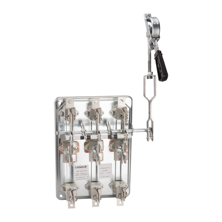 Выключатель-разъединитель 3 полюсный на номинальный ток 400 А, номинальный условный ток короткого замыкания Iq 30 (кА), где установлена передняя смещенная рукоятка, а максимальное сечение присоединяемых медных шин составляет 240 кв. мм.