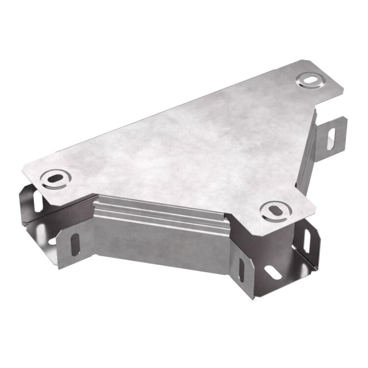 Аксессуары изготовленные из стали с защитным покрытием по методу Сендзимира – это изделия, на которых защитное цинковое покрытие было нанесено на листовую сталь перед изготовлением. Толщина защитного покрытия варьируется от 10 до 22мкм. Климатическое исполнение изделий УХЛ2, что предусматривают эксплуатацию в помещении и под навесом, при температуре эксплуатации от -80 до +150°С. Т-образный ответвитель предназначен для разветвления кабельных трасс в горизонтальном направлении,для перфорированных и глухих лотков. В комплект входит крышка.