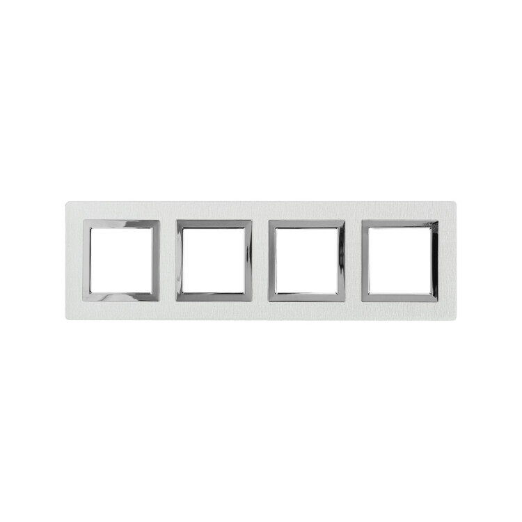 Светлая рамка из алюминия для настенного монтажа. Назначение – декоративное оформление серии электроустановочных изделий "Avanti", монтаж в стену на каркас ЭУИ Avanti (код 4400802). Дизайн разработан B. Dall’Ecco. Материал – алюминий. Фактура – браш. Кол-во модулей – 8.