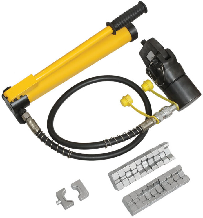 Гидравлические прессы позволяют создавать механические соединения типа кабельная жила-гильза или кабельная жила-наконечник с помощью механической опрессовки. Прессы снабжены сменными матрицами, предназначенными для различных сечений жил. Гидравлические прессы значительно облегчают процесс опрессовки, так как требуют применение меньших усилий, чем механ ические прессы.