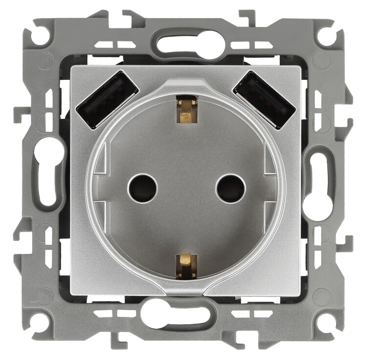 Розетка с заземлением с USB со шторками серии Эра 12 скрытой установки механизм цвет алюминий 12-4109-03. Номинальные характеристики 16А 250В/3А-5В . Сделана из поликарбоната. Монтаж в подрозетник производится и на лапки, и на винты. Рамки приобретаются отдельно. Рамки Эра 12: 1 пост 12-5001-хх, 2 поста 12-5002-хх, 3 поста 12-5003-хх, 4 поста 12-5004-хх, 5 постов 12-5005-хх. Рамки Эра 12 Сатин: 1 пост 12-5101-хх, 2 поста 12-5102-хх, 3 поста 12-5103-хх, 4 поста 12-5104-хх, 5 постов - 12-5105-хх (хх - код цвета: 01-белый, 02-слоновая кость, 03-алюминий, 04-шампань, 05-антрацит, 06-чёрный, 07-ольха(белёный дуб-сатин), 08-вишня, 09-дуб, 10-венге, 11-сосна, 21-жёлтый, 22-оранжевый, 23-красный, 24-охра, 25-бордо, 26-лайм, 27-зелёный, 28-голубой, 29-синий).