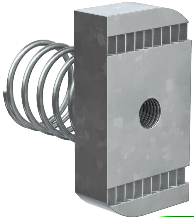 Гайка канальная с пружиной предназначена для крепления элементов STRUT-системы между собой, а также кабельных лотков к STRUT-консолям. Используется с профилем сечения 41х21.