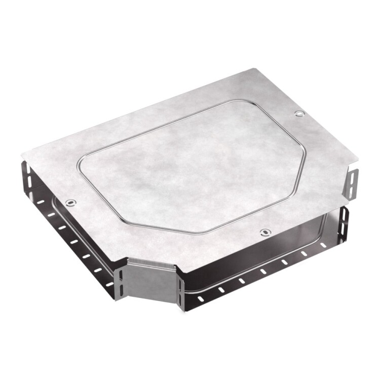 Аксессуары изготовленные из стали с защитным покрытием по методу Сендзимира – это изделия, на которых защитное цинковое покрытие было нанесено на листовую сталь перед изготовлением. Толщина защитного покрытия варьируется от 10 до 22мкм. Климатическое исполнение изделий УХЛ2, что предусматривают эксплуатацию в помещении и под навесом, при температуре эксплуатации от -80 до +150°С. Т-образный ответвитель предназначен для разветвления кабельных трасс в горизонтальном направлении,для перфорированных и глухих лотков. В комплект входит крышка.