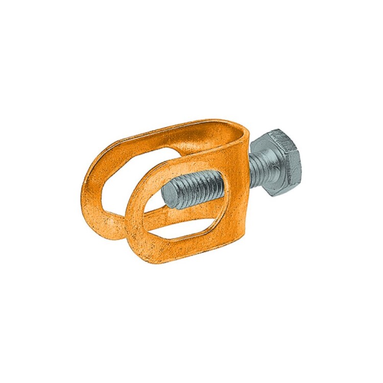 Арт. 90555. Зажим соединительный пруток — стержень, латунь. Зажим выполнен из латуни и позволят соединить пруток и стержень либо молниеприемник диаметром до 18 мм. Соединение прутка и стержня осуществляется затяжкой болта. Болт имеет резьбу М10.