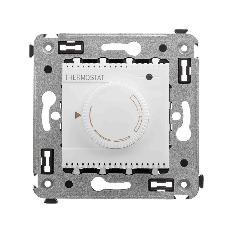 Термостат для теплых полов. Назначение – для монтажа в подрозеточные коробки глубиной не менее 45 мм (код 59301). Предназначен для управления теплыми полами. Характеристики – диапазон от 5 до 30 градусов Цельсия, частота - 50-60 Гц, номинальное напряжение - 230 В, лампа-индикатор включается, когда температура в комнате падает ниже выбранного значения, нагрузка – 12 A - cos-1, 4.8 A - cos-0,4, фиксация в подрозеточные коробки глубиной не менее 45 мм при помощи каркаса с лапками (код 4400802) и саморезов, провод датчика температуры в комплекте (длина 3,5 метра). Цвет – ""Белое облако"".