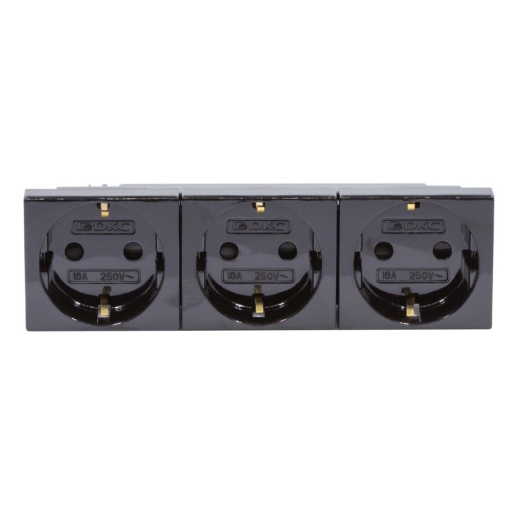 Электрические розетки, штекерные, с заземлением и со шторками, моноблок тройной. Назначение- подключение оргтехники, бытовых приборов и т. п.,экономия времени на подключении кабеля 60 %. Характеристики- в блоке всего 3 клеммы для подключения кабеля – все 3 розетки подключаются одной клеммой,имеется заземление,диаметр отверстий для ввода кабелей ? 3 мм (по 2 отверстия на клемму),соответствие ПУЭ, пункт 7.1.49 ? имеются автоматические закрывающиеся шторки,номинальный ток – 16 А (на весь блок),номинальное напряжение ? 250 B. Кол-во модулей- 6. Установочный размер- 45х150. Цвет- черный