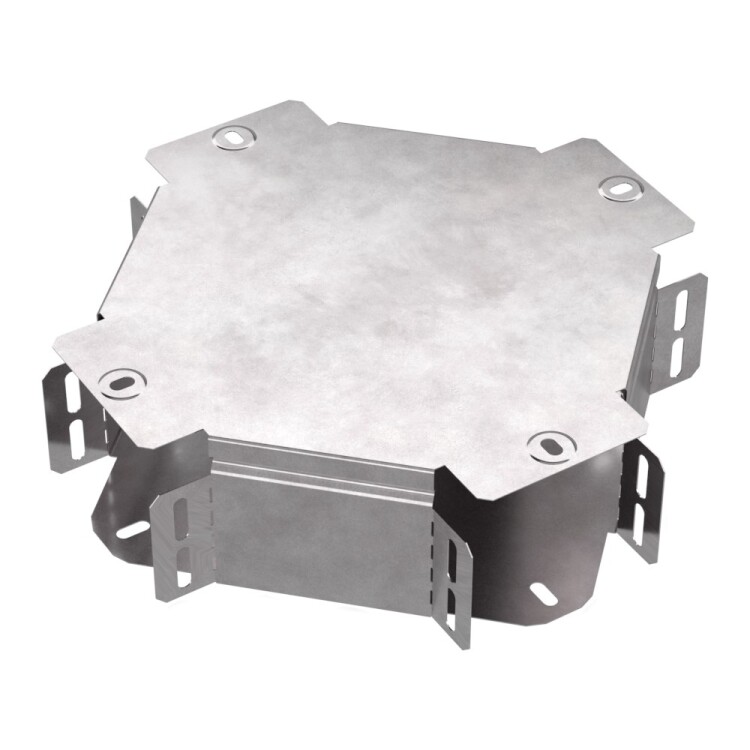 Аксессуары изготовленные из стали с защитным покрытием по методу Сендзимира – это изделия, на которых защитное цинковое покрытие было нанесено на листовую сталь перед изготовлением. Толщина защитного покрытия варьируется от 10 до 22мкм. Климатическое исполнение изделий УХЛ2, что предусматривают эксплуатацию в помещении и под навесом, при температуре эксплуатации от -80 до +150°С. Ответвитель X-обр азный предназначен для разветвления кабельных трасс в горизонтальном направлении, для перфорированных и глухих лотков. В комплект входит крышка.